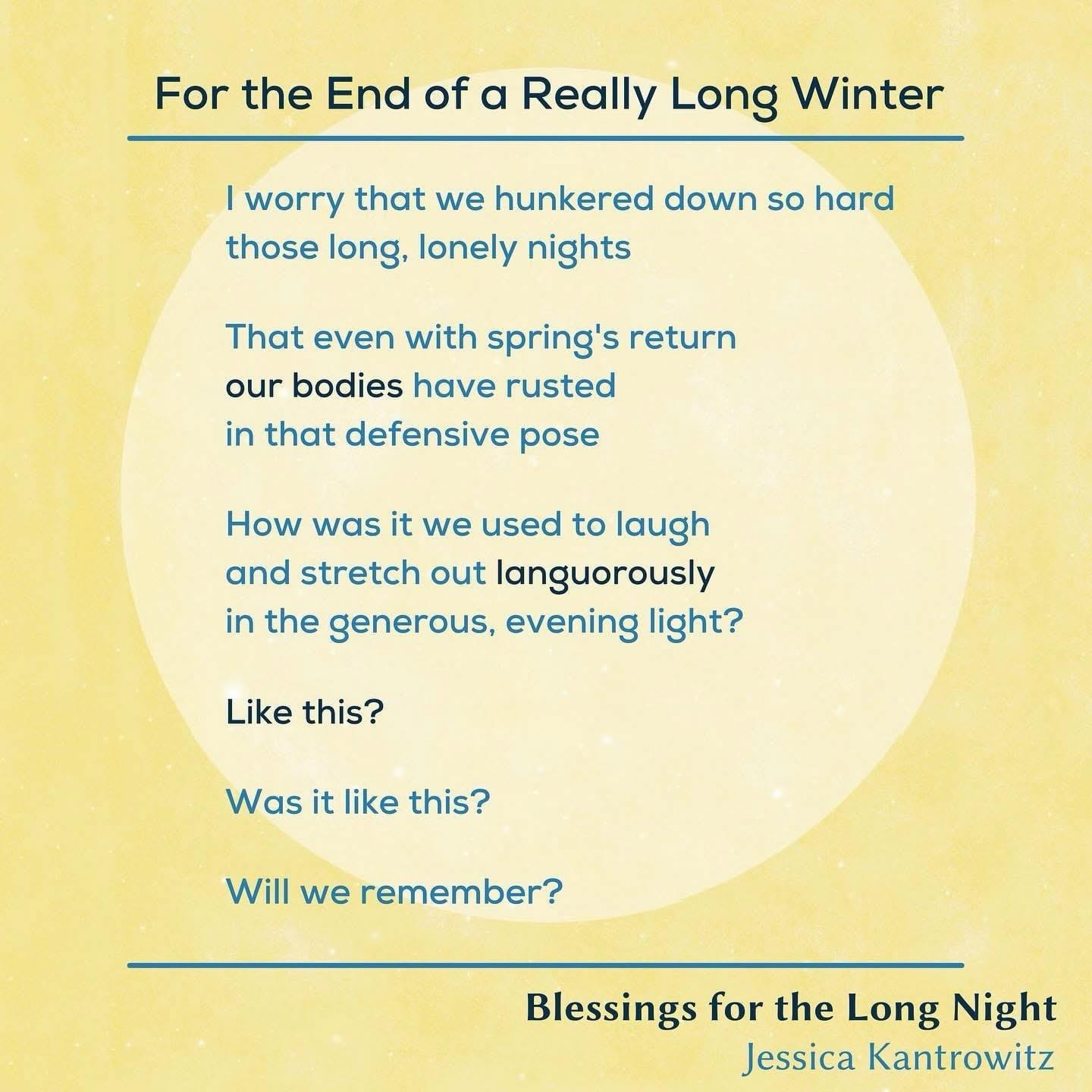 My book, Blessings for the Long Night, came out in 2022, but it was largely written during the first two years of the pandemic. Now, when I read Blessings (along with 365 Days of Peace) it brings me back to that time so vividly. This first poem, For the End of a Really Long Winter, captures that feeling of spring 2021 for me — emerging not just from a long winter, but a long period of isolation, confusion, and fear. The hope was tinged with the trauma of the past year and a half. I think, for many of us, it still is.